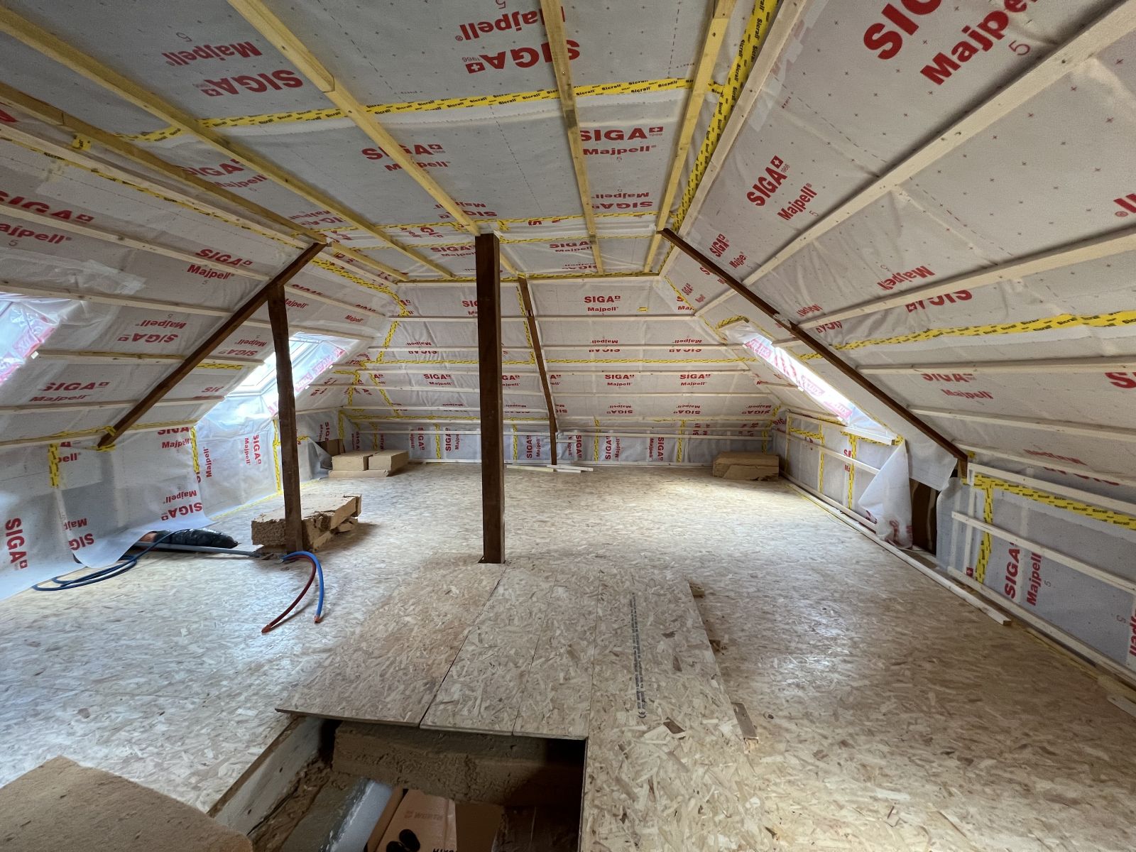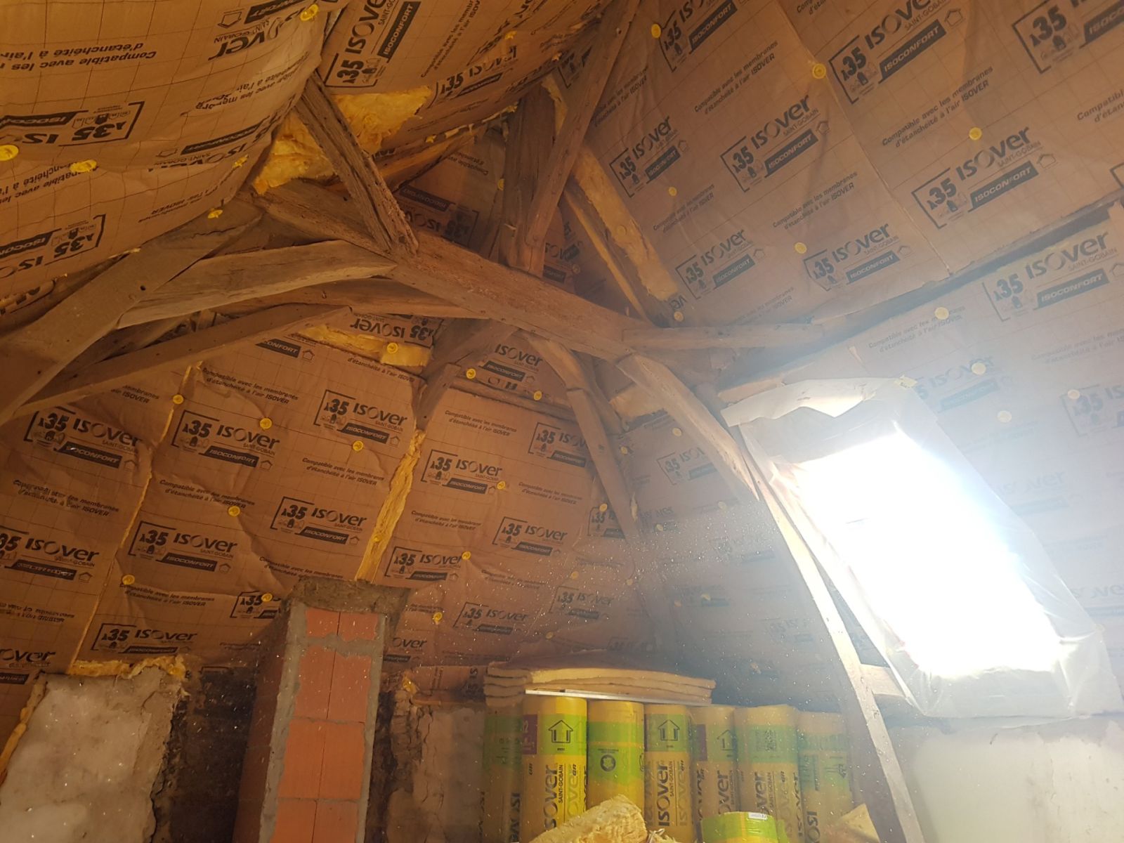 L'isolation sous rampant améliore le confort thermique de l'espace. Nous utilisons des isolants performants et adaptés aux configurations irrégulières, tout en préservant la ventilation nécessaire du bois.