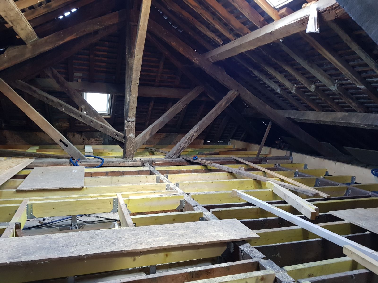 Pour garantir un plancher stable et durable sous une charpente traditionnelle ou ancienne, nous intervenons sur l'ensemble du solivage. Nos équipes procèdent au renforcement et au redressage de solives existantes, afin d'assurer une répartition des charges et une surface plane prête à être aménagée.Nous réalisons également la création des trémies d'escalier, en intégrant ces ouvertures de façon sécurisée et compatible avec la structure d'origine. Une fois la base consolidée, nous mettons en place une isolation performante puis posons des dalles OSB, offrant un plancher rigide, propre et prêt à recevoir les futurs revêtements.
